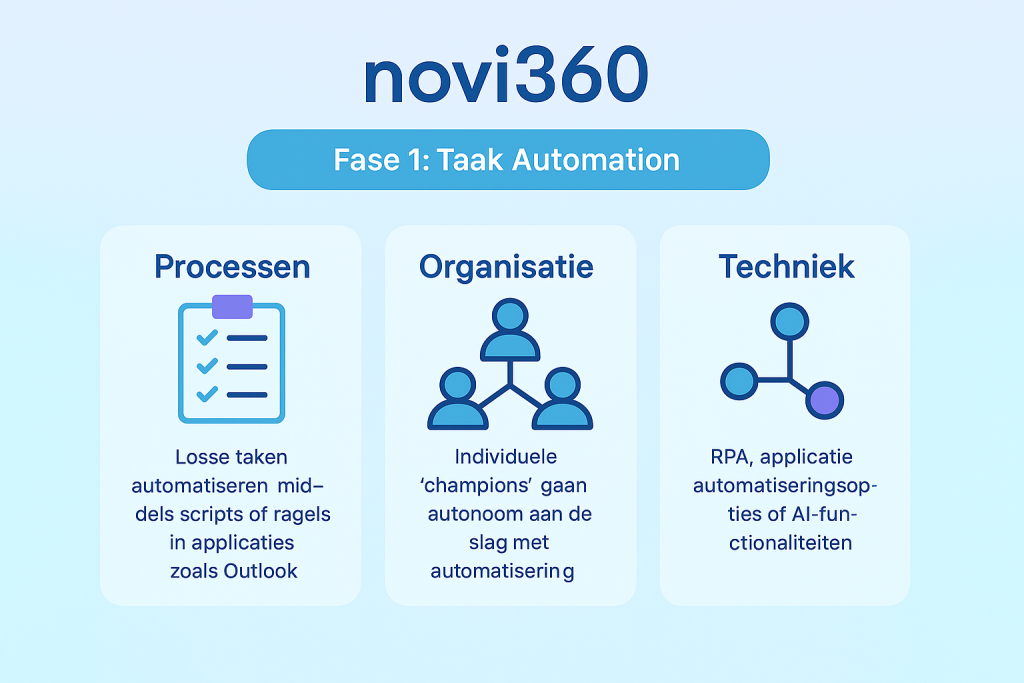 Door te kijken wat werkt, kennis te delen en slimme keuzes te maken, zet je vanzelf de stap naar fase 2: Processtap Automation. Daar automatiseer je niet alleen losse taken, maar hele delen van een proces – zoals checklists of klantafhandeling.