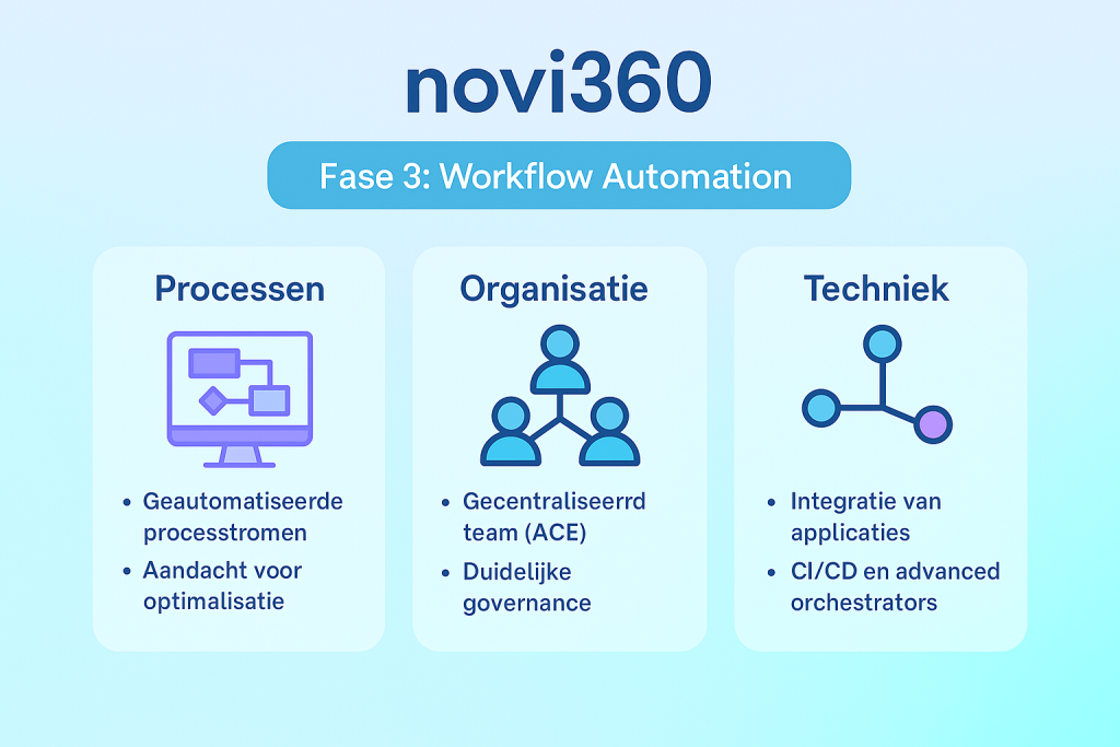 Technisch gezien vraagt fase 3 om volwassen oplossingen. Waar je eerder werkte met losse scripts of RPA-oplossingen, zet je nu geavanceerde orchestrators, CI/CD-methoden en API-integraties in. Alles draait om betrouwbare, schaalbare en onderhoudbare koppelingen tussen systemen.