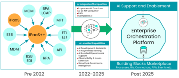 Figuur 1: Evolution from classic iPaaS, to “iPaaS+”, to Enterprise Orchestration Platform