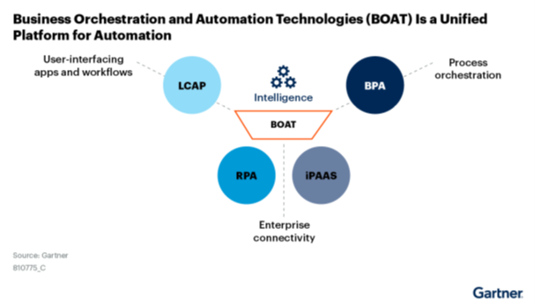 Hyperautomatisering – of zoals Gartner het noemt, het BOAT-platform (Business Orchestration and Automation Technology) – draait om het elimineren van handmatig werk via technologie als RPA, IDP, decision management en AI. Hoewel BOAT een eigen categorie vormt, overlapt het functioneel sterk met EOP’s. In veel gevallen biedt een EOP zelfs een superset aan mogelijkheden ten opzichte van een klassiek BOAT-platform.