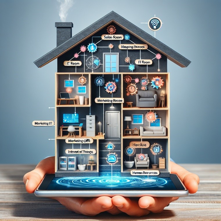 Enterprise Automation is een holistische aanpak van Automation. We leggen deze aanpak uit aan de hand van een groot huis. Stel je een groot bedrijf voor als een uitgebreid huis met verschillende kamers, waarbij elke kamer staat voor een afdeling zoals HR, Financiën, Marketing, en IT. Elk van deze kamers heeft zijn eigen gereedschappen en apparaten, oftewel applicaties en systemen, die ze gebruiken om hun werk te doen. Normaal gesproken werken deze kamers min of meer onafhankelijk van elkaar.