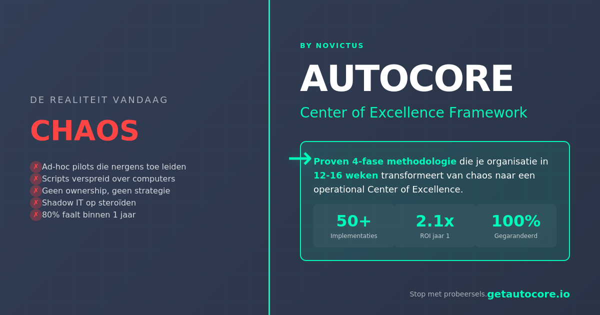 Daarom hebben we bij Novictus AUTOCORE ontwikkeld: een volledig geïntegreerd framework dat je organisatie in 12-16 weken van chaos naar een operationeel Center of Excellence brengt.