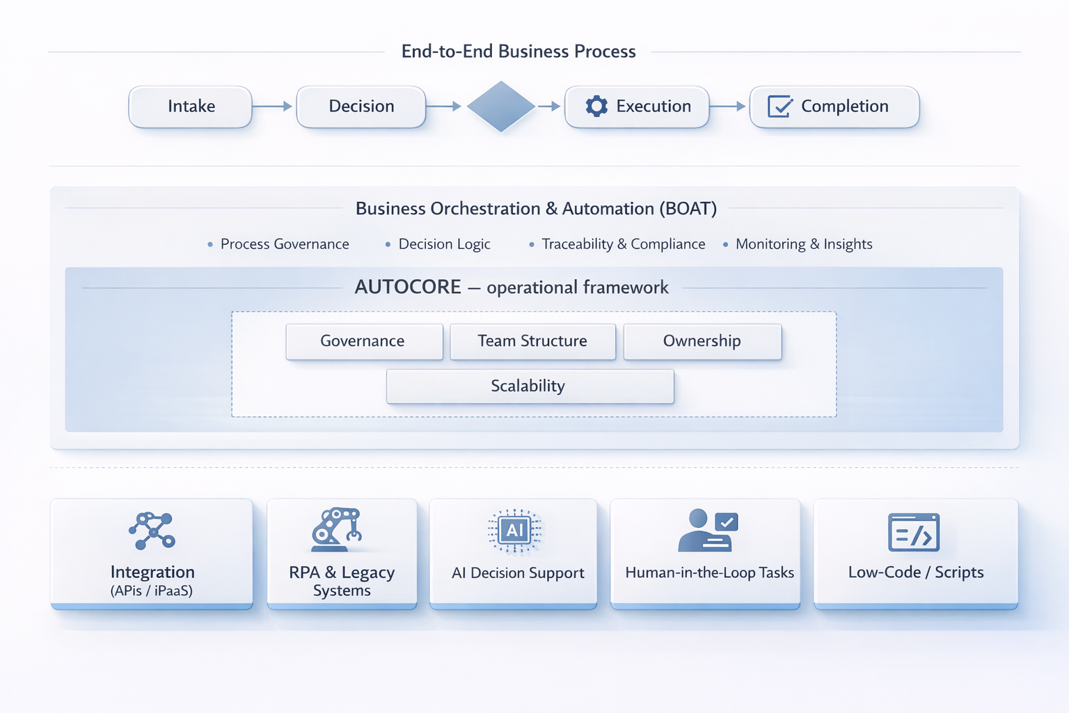 AUTOCORE is ontwikkeld als een praktische invulling van het BOAT-principe. Het biedt organisaties een werkbaar raamwerk om procesorkestratie niet alleen te ontwerpen, maar ook daadwerkelijk te organiseren en uit te voeren.